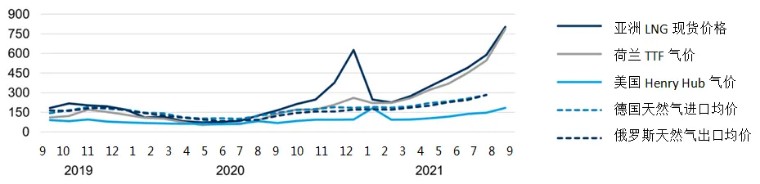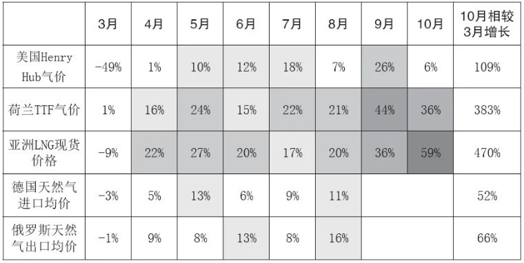 以2021年3月為基期,截至2021年10月,歐洲和亞洲天然氣月均價格已分別上漲了近4倍和近5倍。在經濟全球化背景下,能源問題持續發酵,能源供應短缺正在全球蔓延。