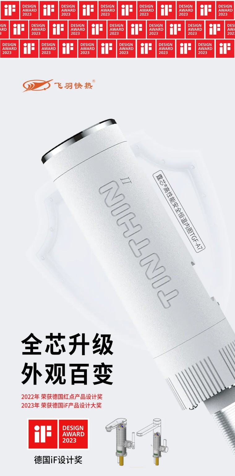 飛羽快熱霆芯?高性能安全恒溫內膽TGF-A7榮獲2023德國iF設計大獎(iF DESIGN AWARD 2023)。這也是繼德國紅點獎之后,我們獲得的又一國際大獎!