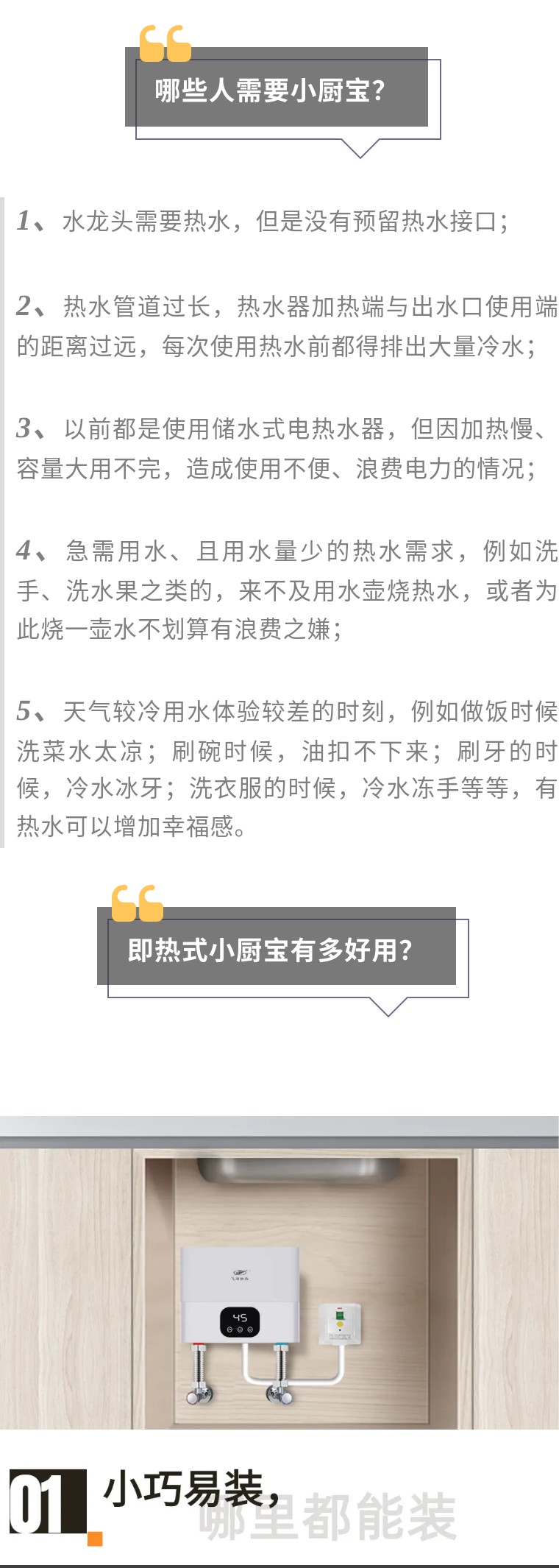 這種迷你廚寶不僅不占地方,且無需預熱打開就能用。直接接上自來水,通過電力加熱,一般打開工作幾秒就出熱水,完美克服因熱水管太長、熱水器距離太遠需要長時間放冷水的弊端。告別“等水五分鐘,用水三分鐘”的長久等待,打造接近“零冷水”的溫暖體驗。