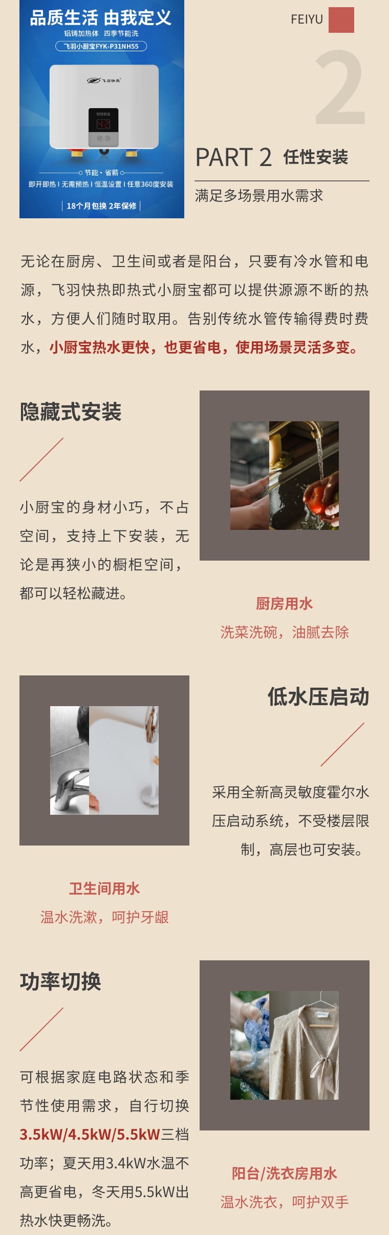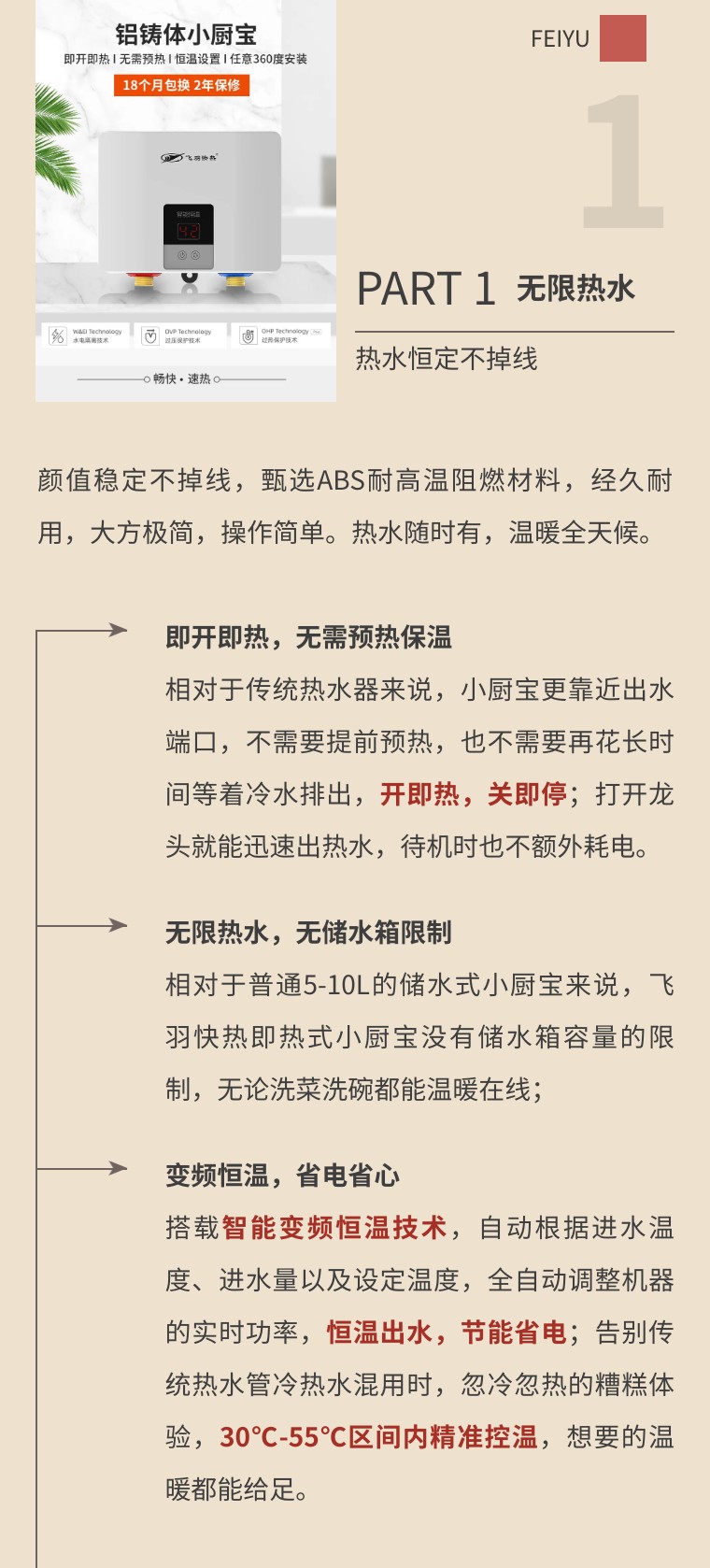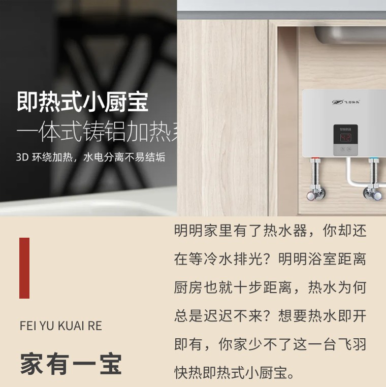 明明家里有了熱水器,你卻還在等冷水排光?明明浴室距離廚房也就十步距離,熱水為何總是遲遲不來?想要熱水即開即有,你家少不了這一臺飛羽快熱即熱式小廚寶。