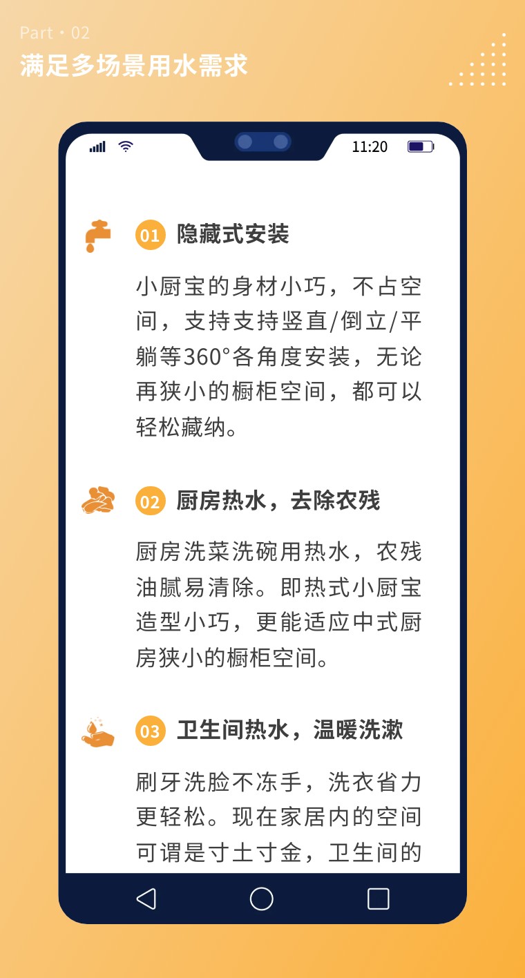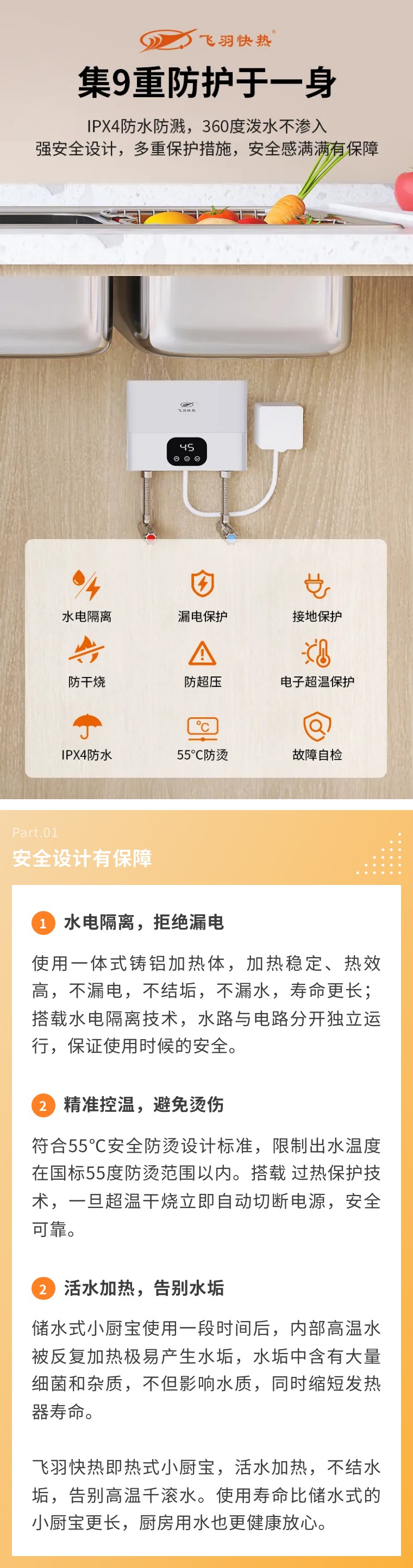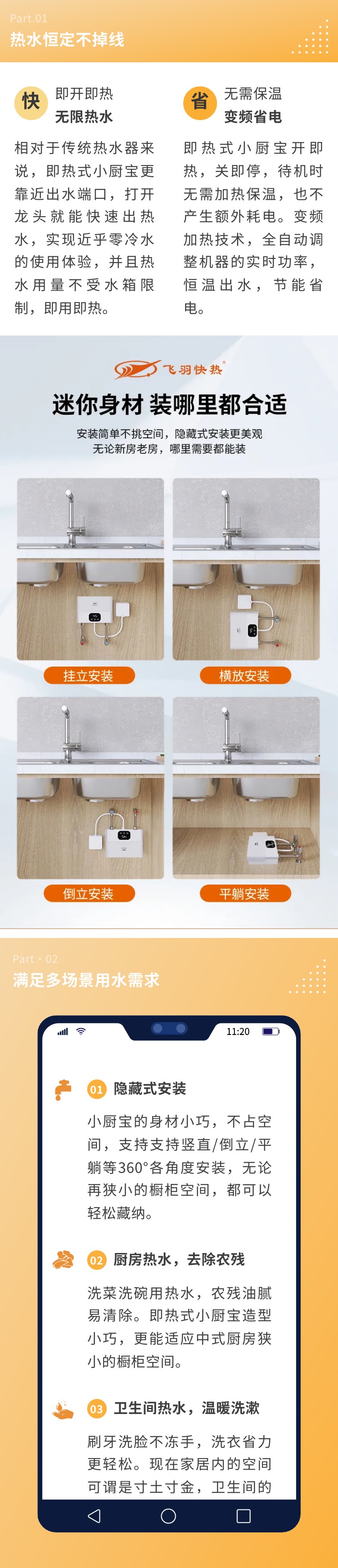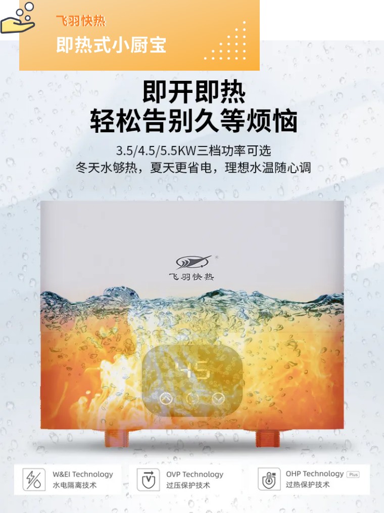 無(wú)論在廚房、衛(wèi)生間或者是陽(yáng)臺(tái),只要有冷水管和電源,飛羽快熱即熱式小廚寶都可以提供源源不斷的熱水,方便人們隨時(shí)取用。告別傳統(tǒng)水管傳輸?shù)馁M(fèi)時(shí)費(fèi)水,小廚寶熱水更快,也更省電,使用場(chǎng)景靈活多變。