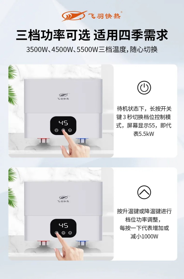 并且,飛羽快熱即熱式小廚寶支持三檔加熱功率調(diào)節(jié),可根據(jù)家庭電路狀態(tài)和季節(jié)性使用需求,自行切換3.5kW/4.5kW/5.5kW三檔加熱功率;夏天用3.4kW加熱功率,水溫不燙更省電,冬天用5.5kW加熱功率,出熱水快更暢洗。